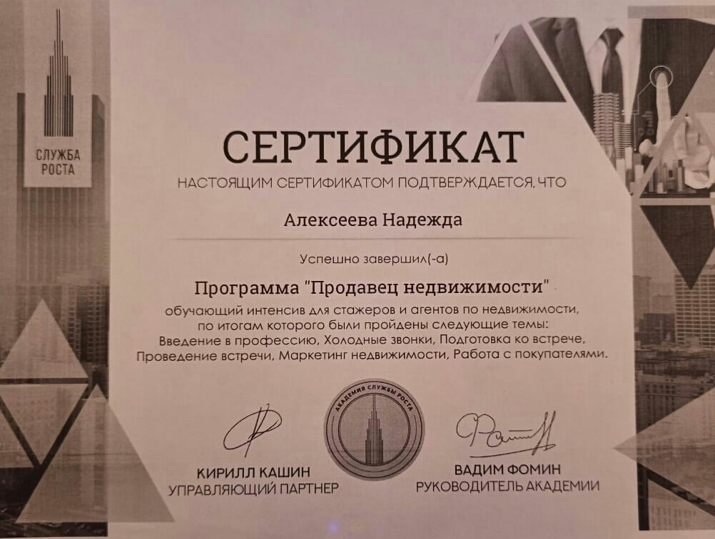 Хочу поблагодарить за отличную работу замечательного риэлтора Надежду. Очень внимательная и юридически грамотная, подсказала и подмечала малейшие нюансы и сложности, что позволило оформить быстро сделку, включая сбор справок и оформление ипотеки. Желаю успехов в работе и адекватных клиентов!!!